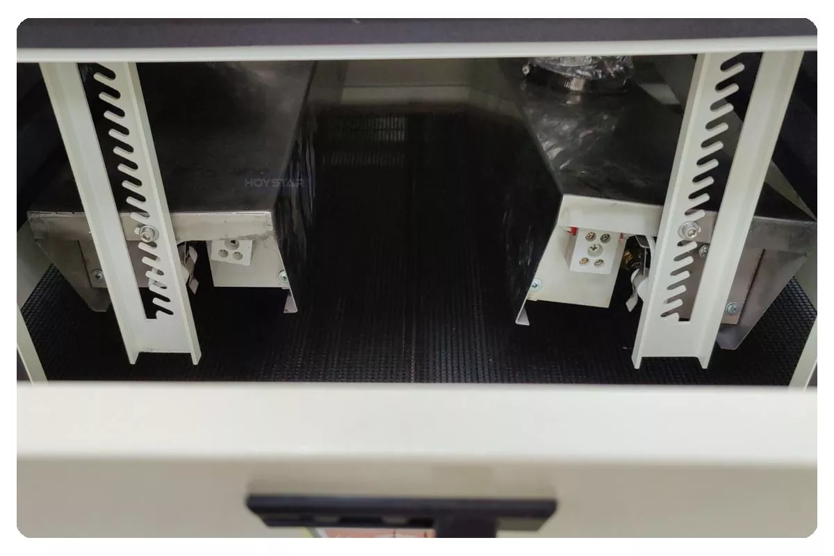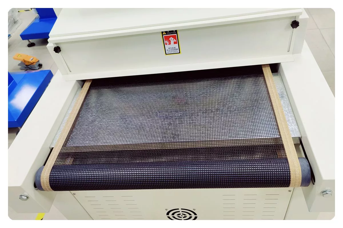 1000 mm pločio konvejerio UV kietėjimo mašinos konvejerio juosta valdoma elektros varikliu, o jo greitis gali būti reguliuojamas pagal reikiamą gamybos greitį, kad atitiktų skirtingus džiovinimo poreikius.