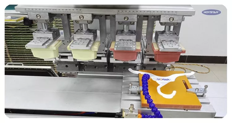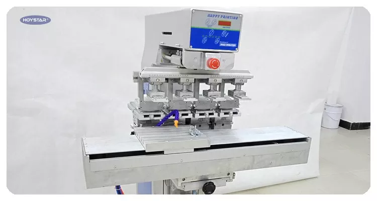 4 spalvų tamponinio spausdinimo mašina su sustabdomu šaudykliniu stalu ir 4 spausdinimo galvutėmis, mašina gali būti naudojama kaip 1 spalvotas tamponinis spausdintuvas su keturiomis galvutėmis.
