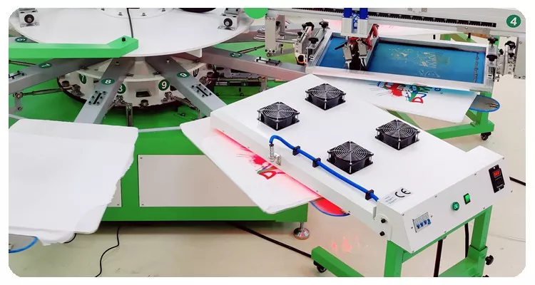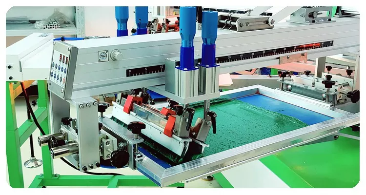 4 spalvų marškinėlių tekstilės spausdinimo šilkografijos mašina su PLC ir jutiklinio ekrano skydeliu, valdymas intuityvus – net ir naujiems naudotojams. Sąsaja leidžia lengvai reguliuoti spausdinimo greitį, spausdinimo režimą ir kt.