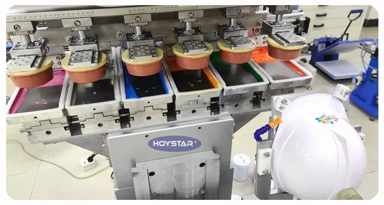 6 spalvų tamponinis spausdintuvas su Shuttle Worktable su SCM (vieno lusto mikrokompiuterio) IC programuoja veiksmų seką. Tiek pusiau automatiniu, tiek automatiniu režimu operatoriai gali prisitaikyti prie skirtingų gamybos poreikių.