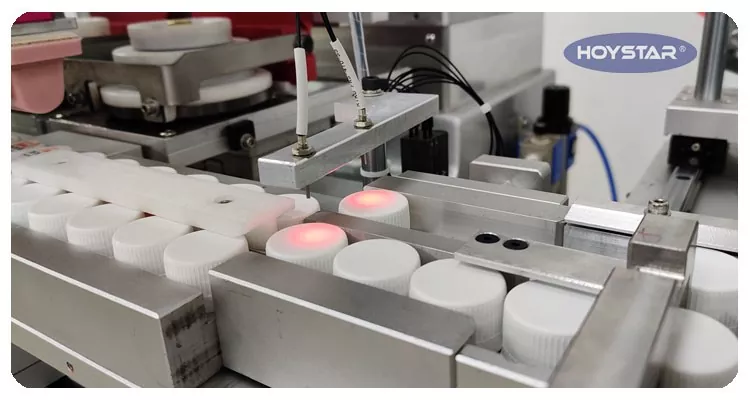 Įrenginys sukonfigūruotas su liepsnos apdorojimo sistema, kuri pagerina rašalo sukibimą su butelių dangtelių paviršiais ir pagerina spausdinimo patvarumą.