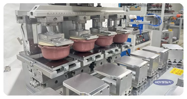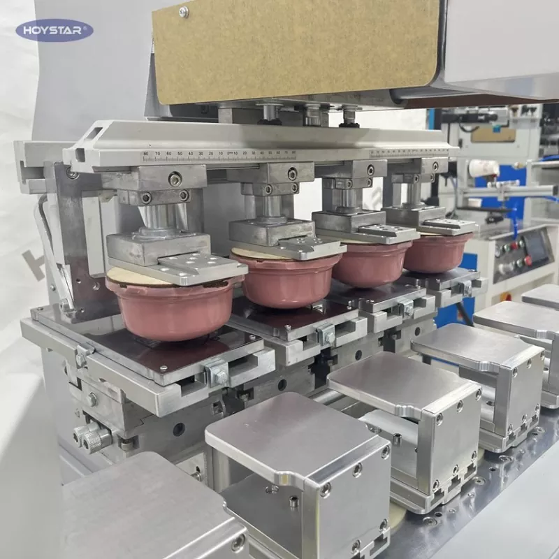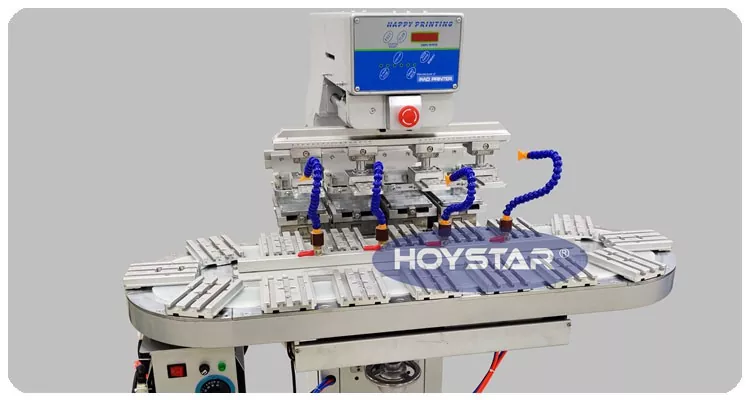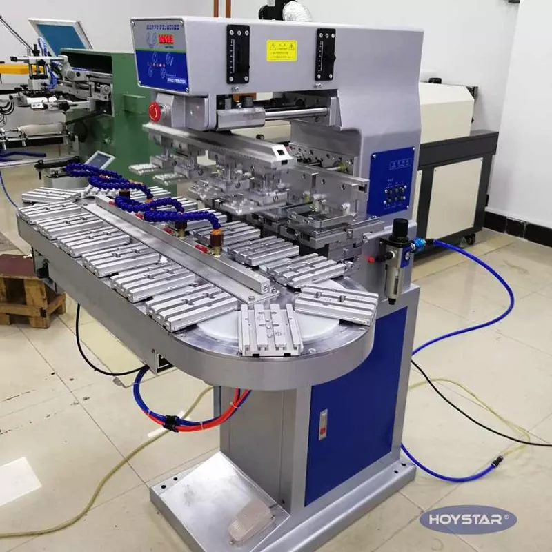 Kaip profesionalus gamintojas Kinijoje, norėtume pateikti jums didelio efektyvumo HOYSTAR didelio dydžio keturių spalvų tamponinį spausdintuvą su konvejeriu. Šis aparatas įgalina nepertraukiamą keturių spalvų tamponinį gaminių spausdinimą, gali atlikti spalvų registraciją per vieną ciklą. This machine adopts rotary turntable conveying system, which enables continuous and smooth product transfer throughout the printing process, ability to complete full 4 color overprinting in just one rotary cycle. Palyginti su šaudyklės tipo tamponiniais spausdintuvais, jo greitis yra labai didelis.