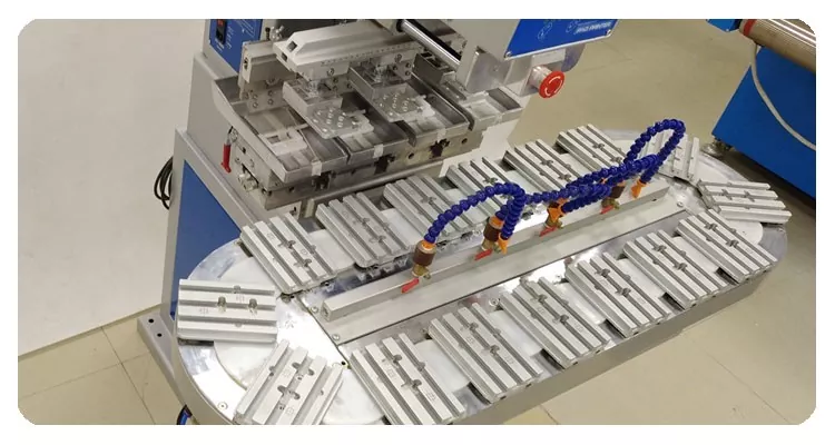 Didelio dydžio keturių spalvų tamponinis spausdintuvas su konvejeriu