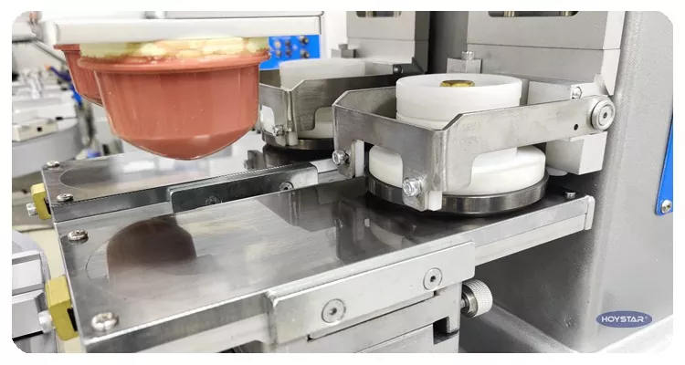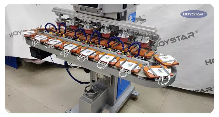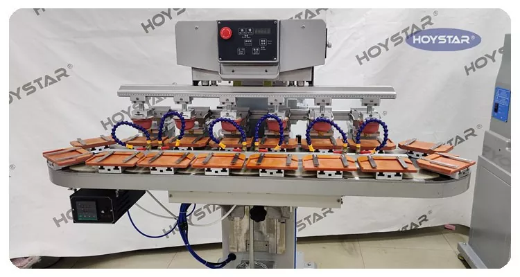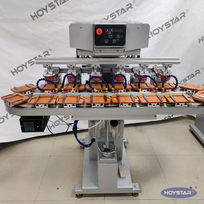 Kaip profesionalus gamintojas Kinijoje, norėtume pateikti jums didelio efektyvumo HOYSTAR šešių spalvų tamponinį spausdintuvą su konvejeriniu stalu. Šis aparatas įgalina nepertraukiamą šešių spalvų tamponinį gaminių spausdinimą, vieną spalvų registraciją užbaigus per vieną ciklą. Ši mašina naudoja sukamą patefono transportavimo sistemą, kuri leidžia nepertraukiamai ir sklandžiai perkelti gaminį viso spausdinimo proceso metu, o per vieną sukimosi ciklą galima atlikti visą 6 spalvų antspaudą. Palyginti su šaudyklės tipo tamponiniais spausdintuvais, jo greitis yra labai didelis.